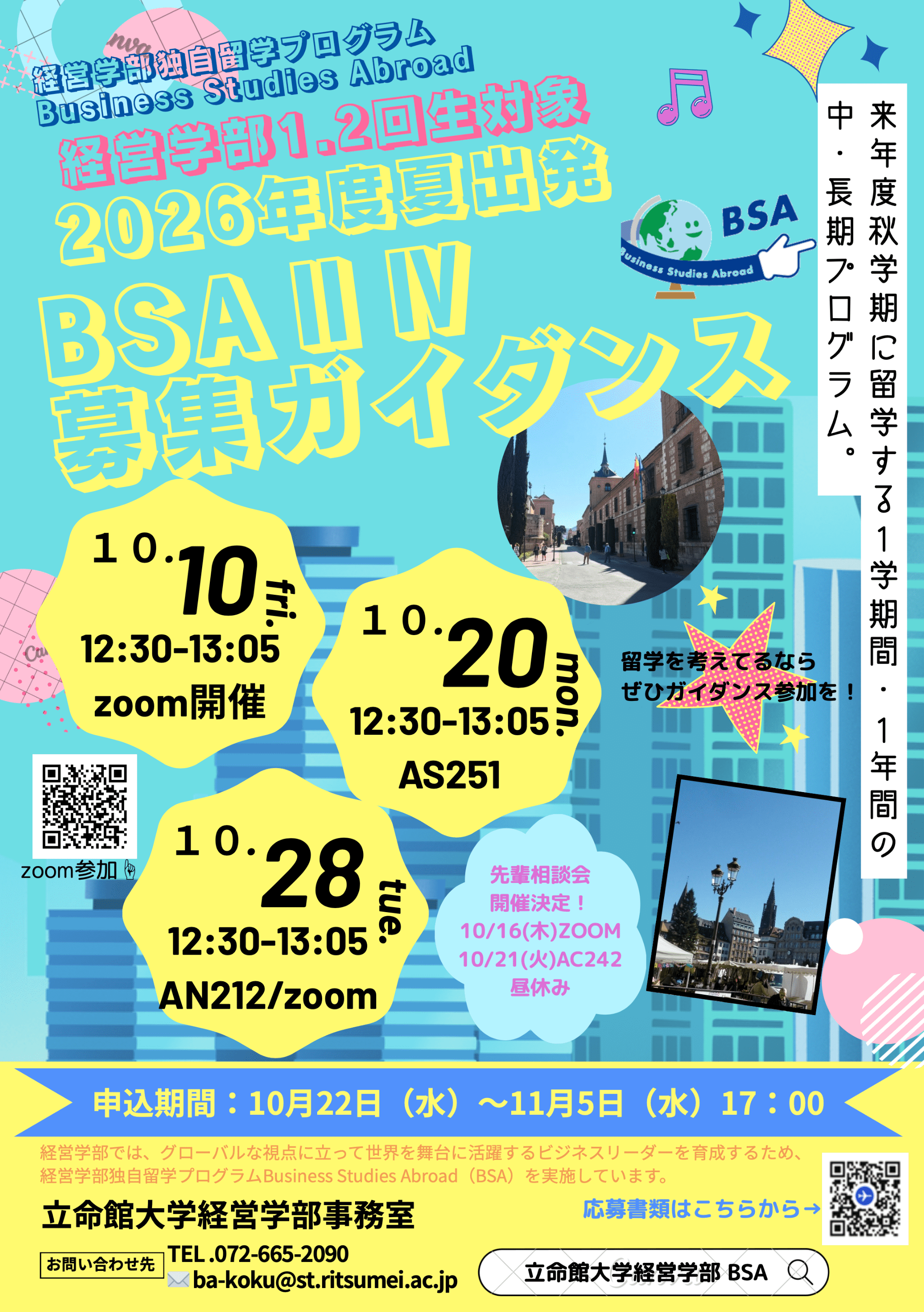 BSAは経営学部独自の海外派遣・留学プログラム「Business Studies Abroad」の略称で、経営学部生のためのプログラムとして開発・運営をしています。海外で生活し、経営学の分野の学習を英語・中国語、その他現地の言語で行うことで、高度な外国語運用能力、経営学の専門知識・能力、日本だけではなく海外の文化を知悉した広く深い教養、柔軟な思考や現実感覚、それらを身につけ、「グローバルな視点に立って世界を舞台に活躍するビジネスリーダー」の育成を目的としたプログラムです。